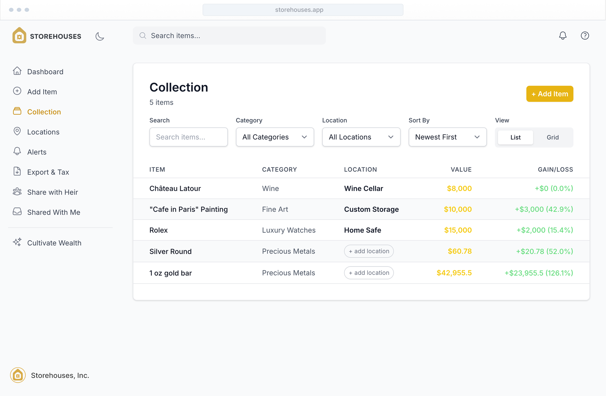 Manage your portfolio of precious metals, jewelry, wine, and other collectibles with the only privacy-first app built exclusively for physical assets.