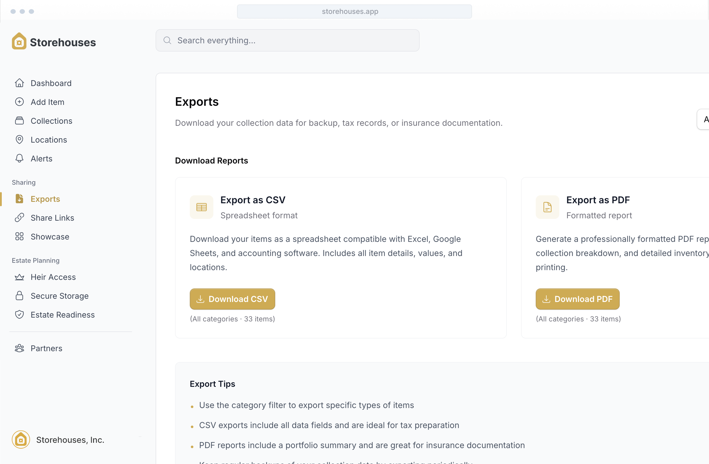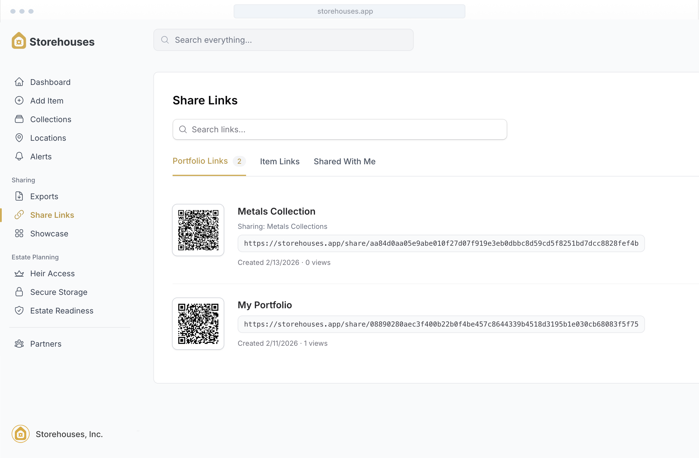 Storehouses helps you create a structured record of your physical assets — including provenance, purchase history, documentation, and storage location — so your tangible wealth is organized in one secure place rather than scattered across notes, spreadsheets, or memory.