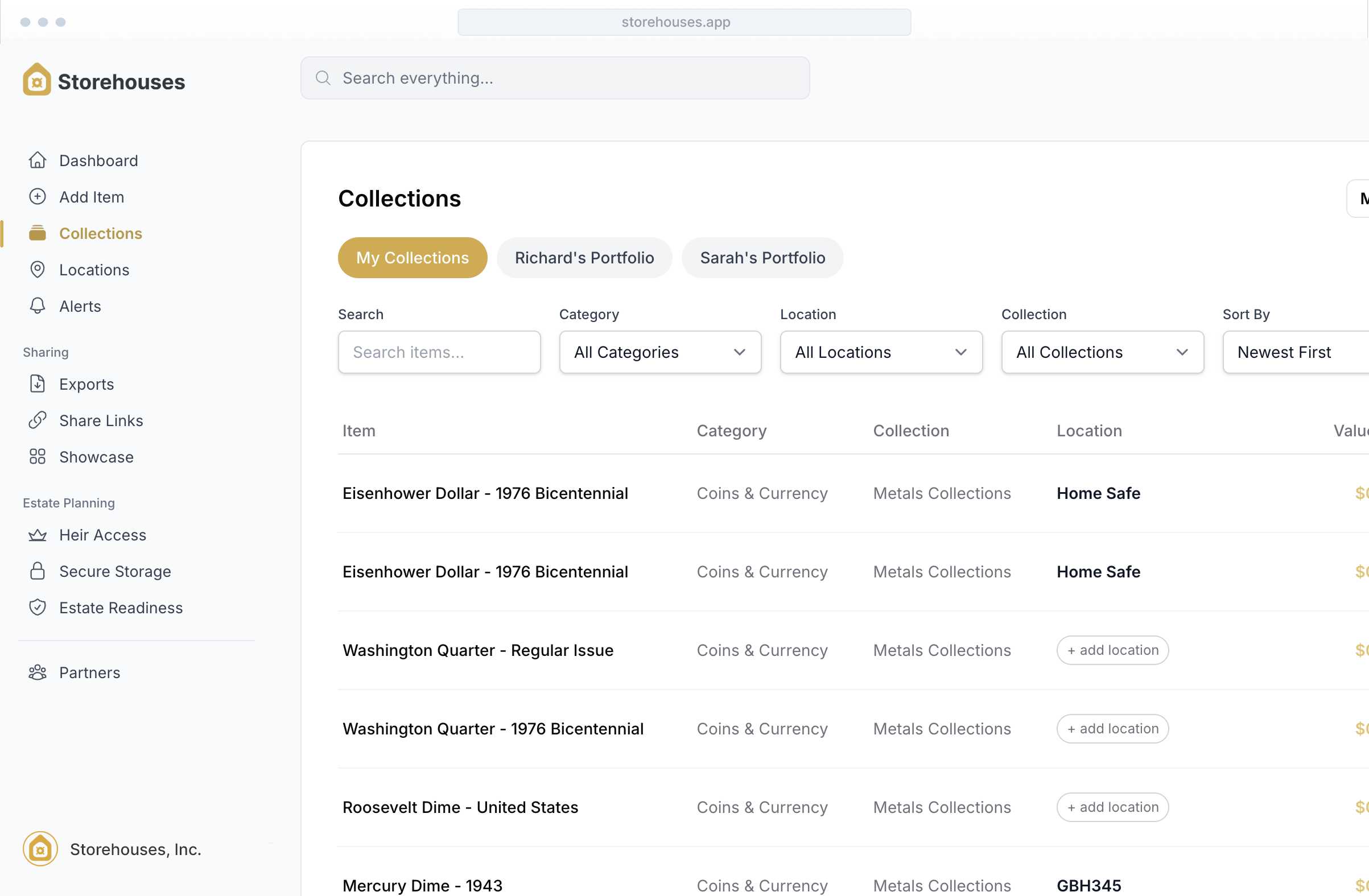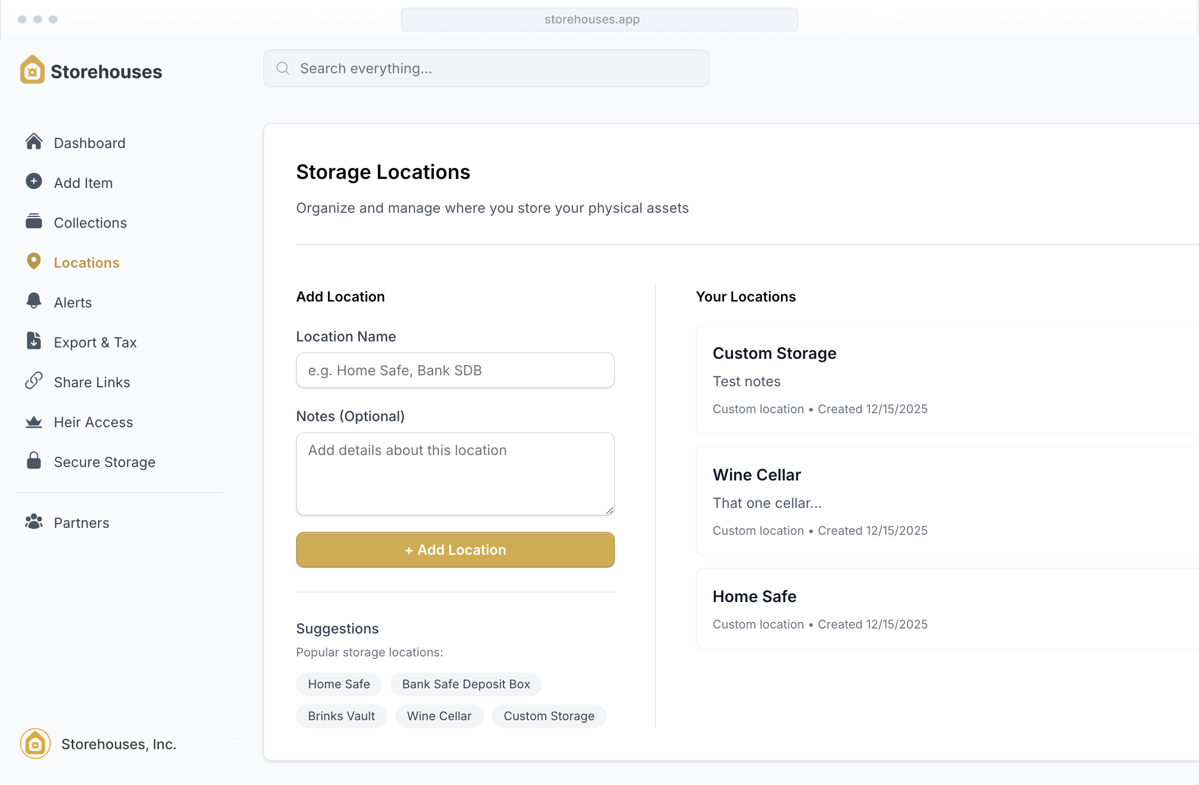 Storehouses helps you create a structured record of your physical assets — including provenance, purchase history, documentation, and storage location — so your tangible wealth is organized in one secure place rather than scattered across notes, spreadsheets, or memory.
