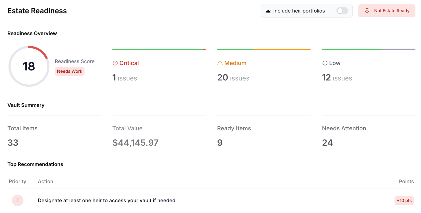 Add items to your collections to keep track of your assets and their value, history, and other important details. Also view portfolios of heir-connected accounts